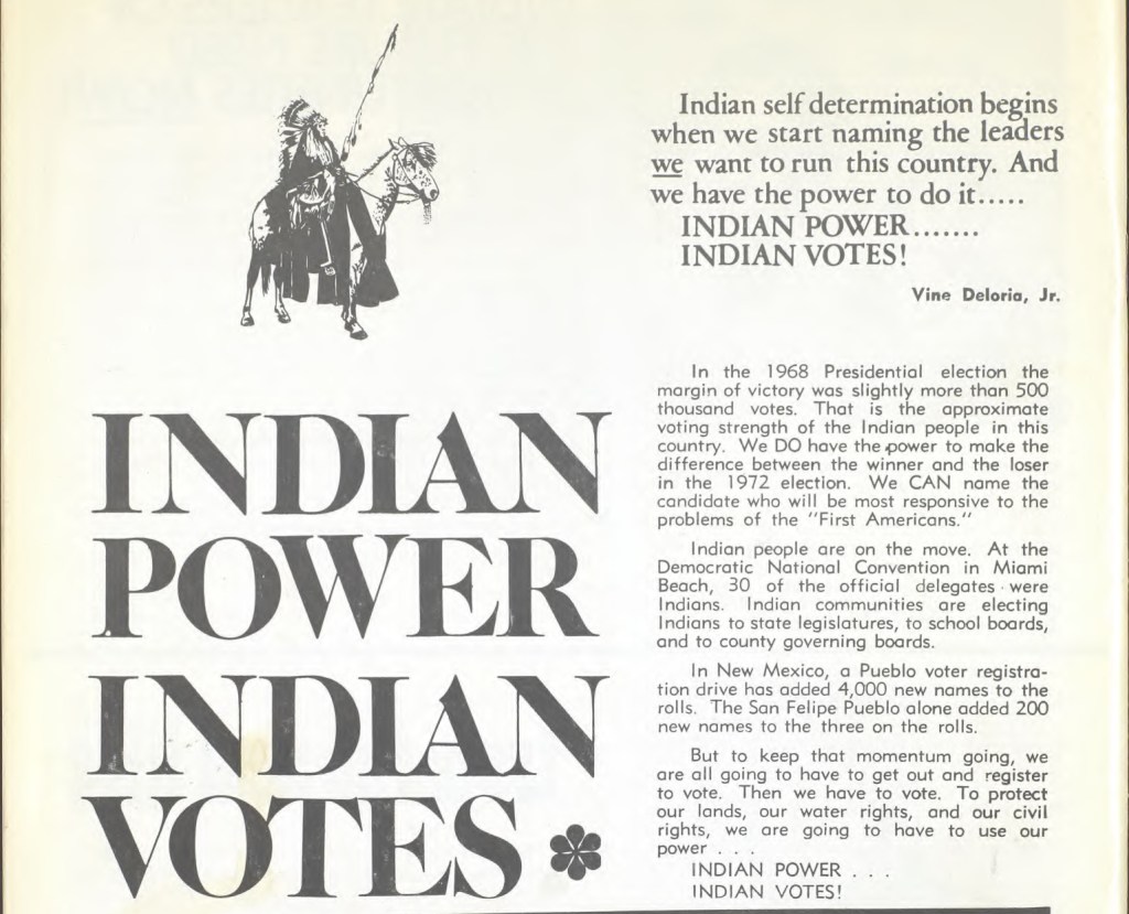 Since that time, NCAI had adopted many resolutions calling for the elimination of Native voter disenfranchisement, urging the registration of eligible voters, and ensuring full and equal access to the polls. In addition, archival issues of the NCAI Sentinel featured comparisons of presidential candidates in regard to their stance on issues of importance to American Indian and Alaska Native people. In 1952, in advance of a presidential election, NCAI leaders urged Native voters to remember, “We speak when we vote.”–a statement that still rings true today and a recognition of the political power of Native people.